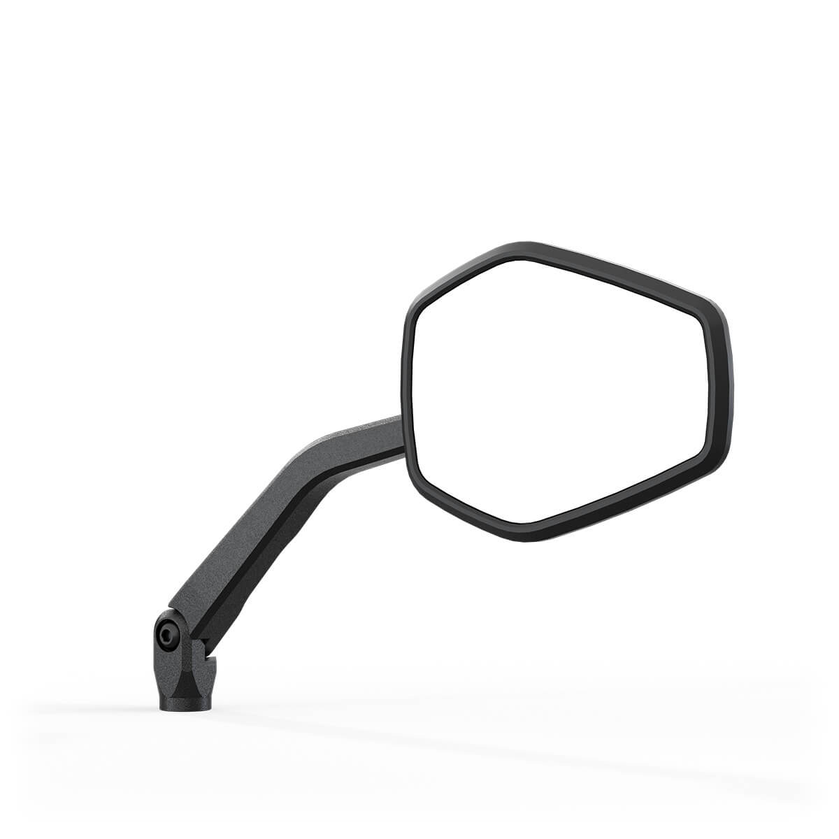 Den perleblæste og mat sorte anodiserede overflade af aluminium kontrastrerer flot med spejlhovedets overflade og fuldender det samlede udtryk. Armen er også lavet i aluminium og giver, gennem sin krumning og størrelse, en bred udsigtsvinkel af spejlhovedet, hvilket sikrer et særligt godt bagudblik. Desuden giver designet tilstrækkelig plads mellem styrområdet og spejlarmen.