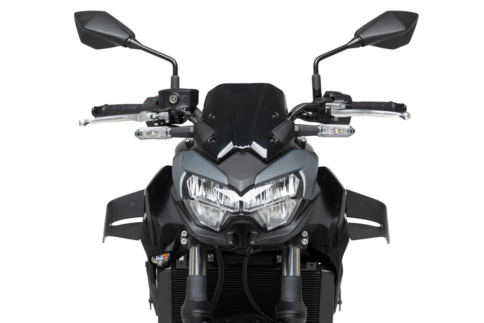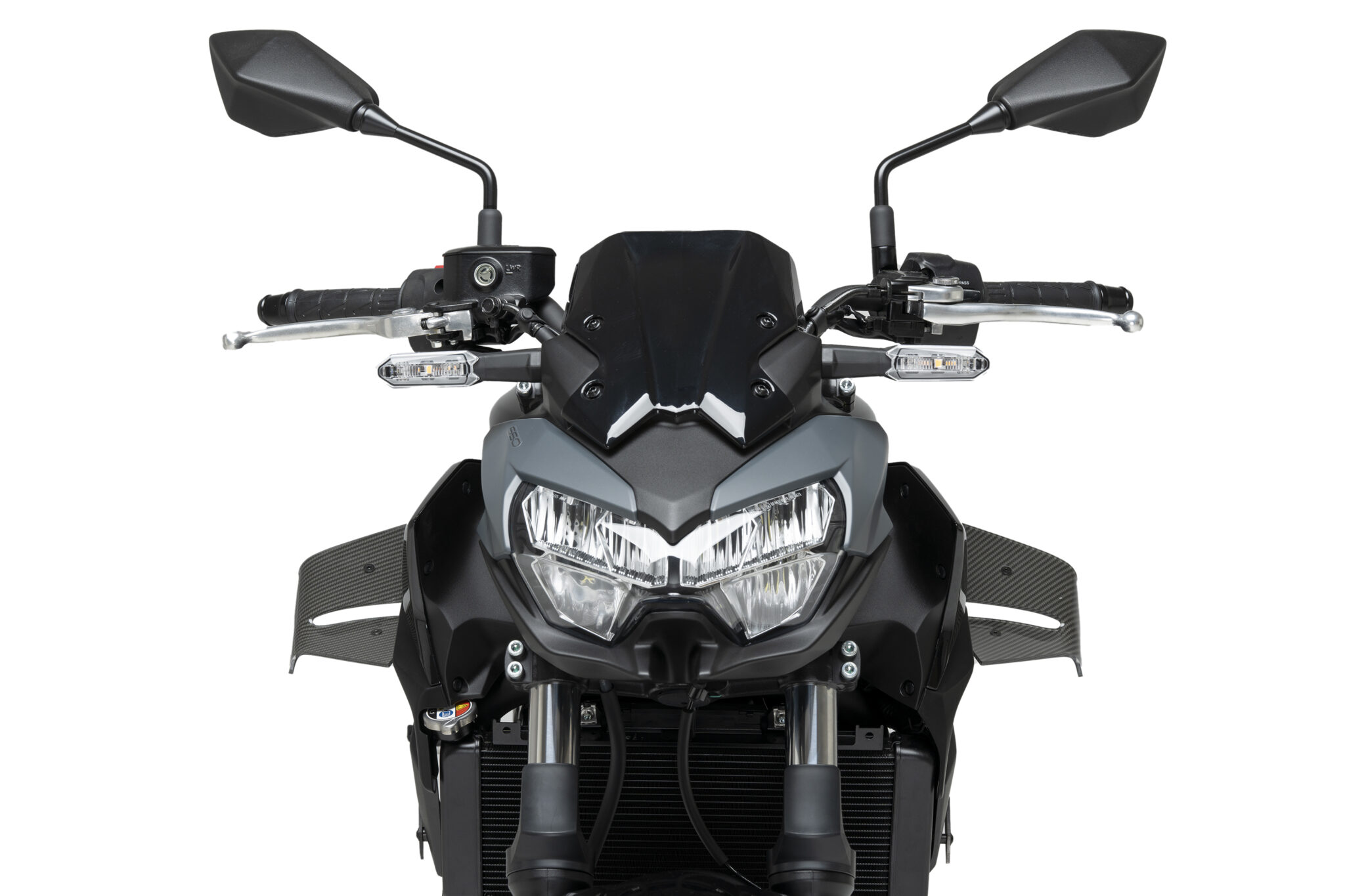 Puig D12 Downforce Spoilers er udviklet til at forbedre motorcyklens stabilitet ved høj fart og under acceleration. De dobbelte vinger leder luftstrømmen, så der skabes op til 4,4 kg downforce på forhjulet, hvilket modvirker løft af forhjulet og øger stabiliteten.
